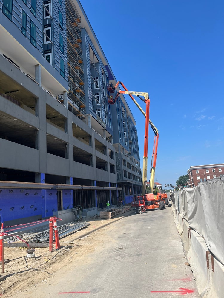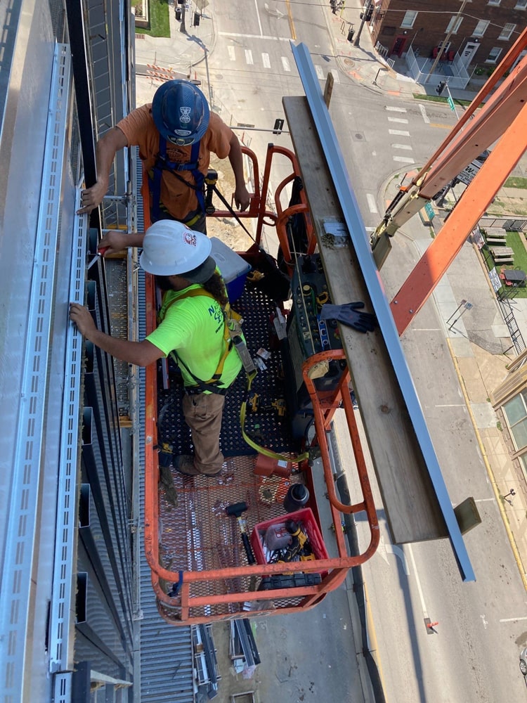 Installed Nichiha, metal panels, and ACM panels on a new 10-story mixed-use building in Midtown Omaha, reaching heights of up to 125 feet.