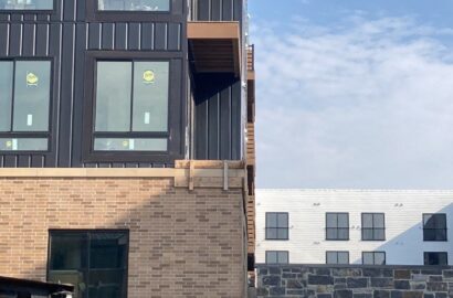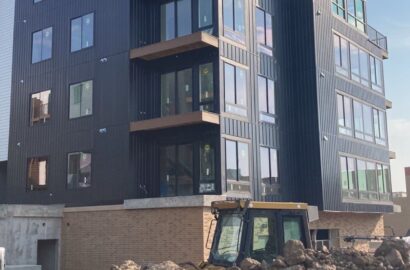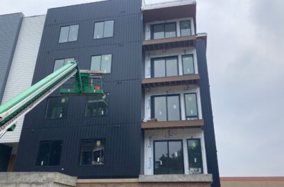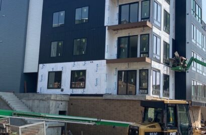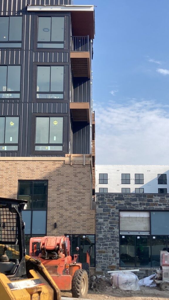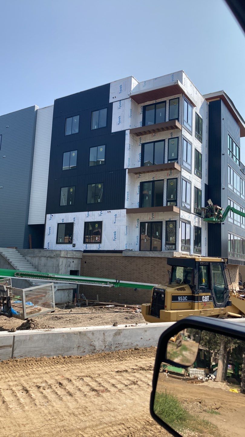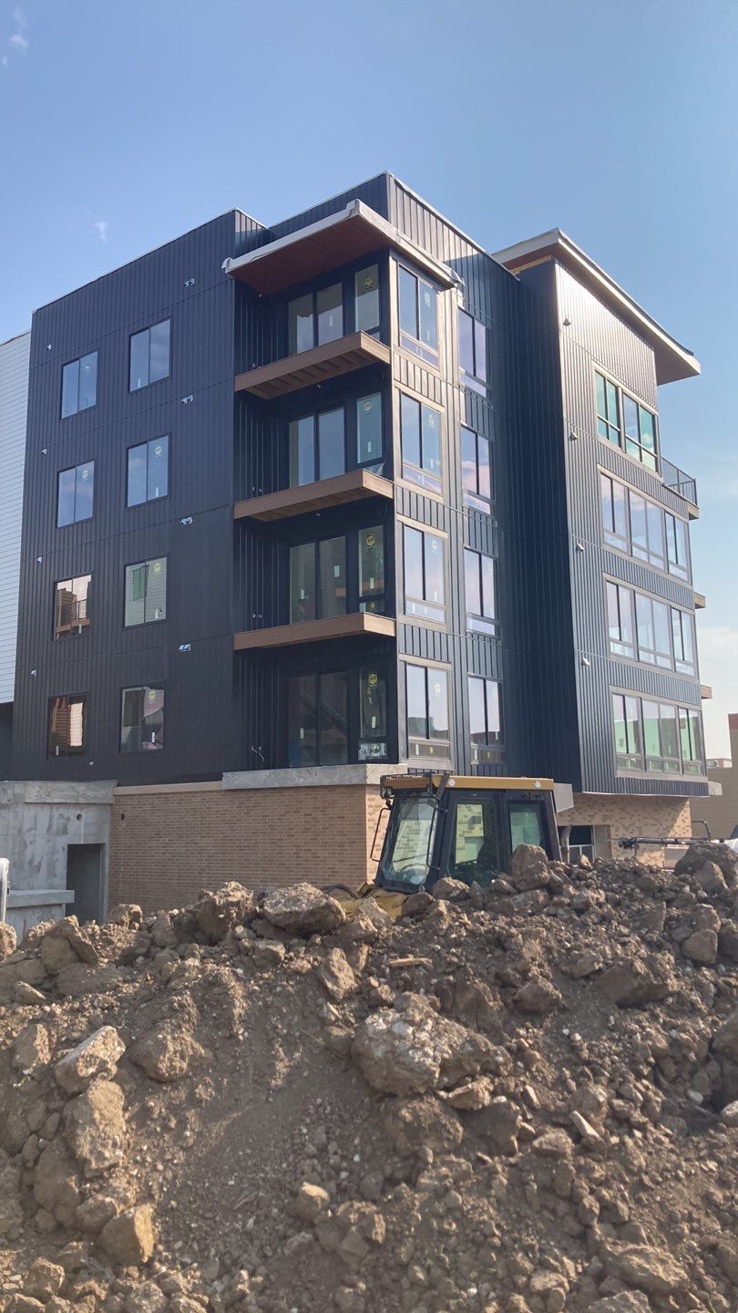 Installed cement board and metal siding on a distinctive 4-story urban development with modern aesthetics along a main thoroughfare, utilizing an 85-foot lift for the project